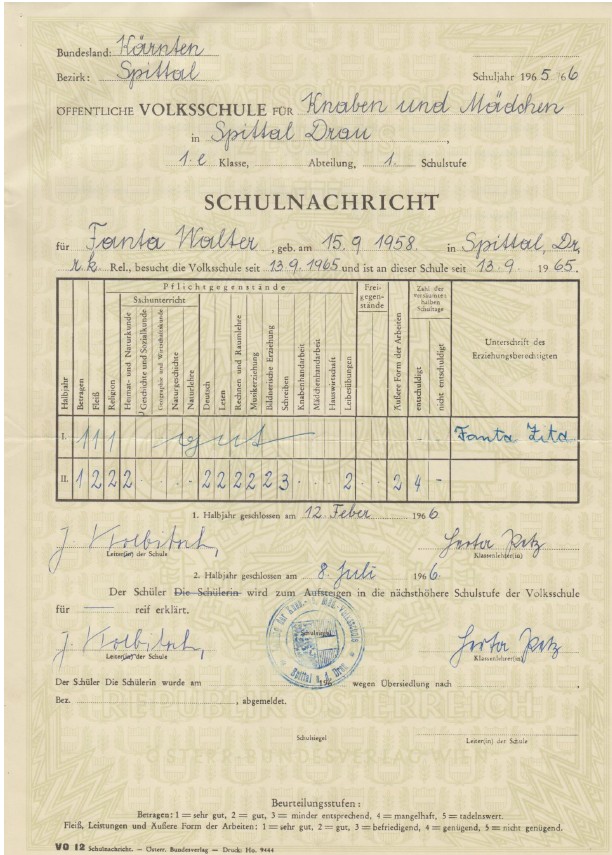 Mein erstes Schulzeugnis der Volksschule für Knaben und Mädchen in Spittal/Drau, ausgestellt von Frau Lehrerin Herta Petz am 8. Juli 1966. Im ersten Halbjahr gab es nur die Gesamtnote „gut“, am Ende des Schuljahres keinen einzigen Einser außer in Religion, und in Schreiben einen Dreier. Dahinter verbirgt sich ein frühes Lebensdrama: meine Linkshändigkeit. Man hat mir das Schreiben mit der rechten Hand beibringen wollen.