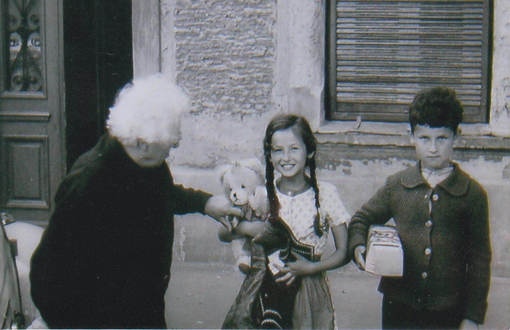 Maria und ich mit Tante Steffi vor dem Haus Münzgrabenstraße 114 in Graz. Das Haus spielt eine wichtige Rolle in der Familiengeschichte. Es wurde 1903 von meinem Urgroßvater Eduard Frank erworben und befindet sich heute im Eigentum meiner Schwester Maria.