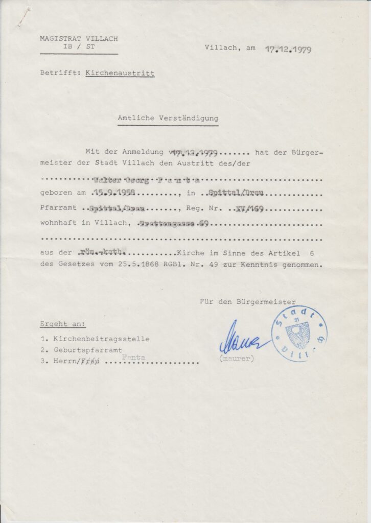 Aus der katholischen Kirche ausgetreten bin ich am 17.12.1979 im Magistrat der Stadt Villach.