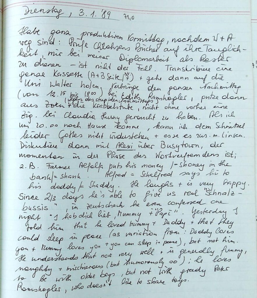 Habe ganz produktiven Vormittag, nachdem W + A weg sind: Prüfe Clohsens Bücher auf ihre Tauglichkeit, mir bei meiner Diplomarbeit als Raster zu dienen – ist nicht der Fall. Transkribiere eine ganze Kassette (A + B Seite / Nr. 7) + gehe dann auf die Uni Walter holen. Verbringe den ganzen Nachmittag bei Edith Ramskogler, putze dann aus Zorn (wegen des stupiden Nachmittags), nicht ohne vorher eine Zigarette bei Claudia Husny geraucht zu haben. Als ich um 20.00 nach Hause komme, kann ich dem Schnitzel leider Gottes nicht wiederstehen + esse es zus. mit Linsen. Diskutiere dann mit Alexi über Busytown, der momentan in der Phase des Wortverfremdens ist; z.B. Framer Alfalfa puts his money /= shoney in the bank /= shank. Alfred = Schalfred says hi to his daddy /= Shaddy. He laughs + is very happy. Since 2/3 days he’s able to give us real „Schnalzbussis“, in Zeutschach he even confessed ohne nicht „Ich hab dich lieb, Mummy + „Papi“. Yesterday I told him that he loved Mummy + Daddy + that he could sleep in peace (as variation from: Daddy loves you + you can sleep in peace), but not him. He understands that now very well + is generally funny, naughty + mischievous (but humorously so); he loves to be with older boys, but not with gready Peter Ramskogler, who doesn’t like to share toys.