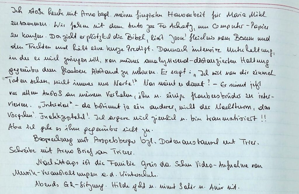 Ich stoße heute mit Arno bzgl. meiner fingierten Hausarbeit für Maria Mikl zusammen. Wir fahren mit dem Auto zu Fa. Achatz, um Computer-Papier zu kaufen. Da zieht er plötzlich die Bibel, liest Jesu‘ Gleichnis vom Baum und den Früchten und hält eine lange Predigt. Dannach intensive Unterhaltung, in der er mich zwingen will, von meiner analysierend-distanzierten Haltung gegenüber dem Glauben Abstand zu nehmen. Er sagt: „Ich will von dir einmal Taten sehen, nicht immer nur Worte!“ Was meint er damit? – Er nimmt jetzt vor allem Anstoß an meinem Verhalten, ihn u. einige Glaubensbrüder zu interviewen. „Interview“ – da bestimmt ja ein anderer, nicht der Wachtturm, das Vorgehen! Inakzeptabel! Ich ärgere mich ziemlich u. bin traumatisiert!! Aber ich gebe es ihm gegenüber nicht zu.
