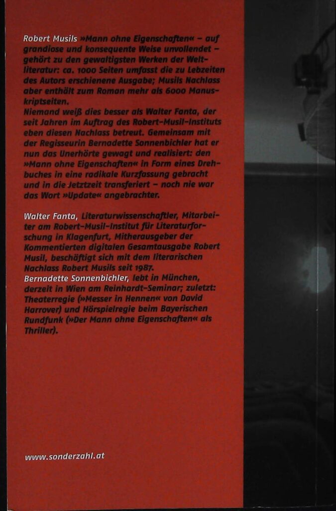 Im Mai 2005 erscheint im Sonderzahl-Verlag in Wien das Update des „Mann ohne Eigenschaften“ als Buch zu einer imaginären Verfilmung von Musils in die Gegenwart versetzten Roman. An diesem Vermittlungsprojekt habe ich bereits nach dem Abschluss der Dissertation 1999 zu schreiben begonnen, unter dem Stichwort „Drehbuch“ erscheint das Projekt 2000-2004 ständig in meinen Arbeitsprotokollen. Die Veröffentlichung hat also eine lange und komplizierte Vorgeschichte. Sie beginnt schon in der Ära der Musil-Nachlass-Transkription mit Arno Rußegger als Partner; die Kooperation mit Bernadette Sonnenbichler ergibt sich erst ganz zum Schluss als Nebeneffekt der Mitarbeit am Remix-Projekt.